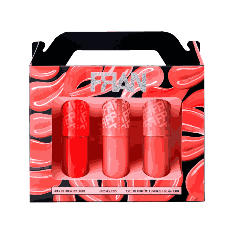 O Kit Fran by Franciny Ehlke Glosslicious apresenta três glosses com efeito vinílico e ultra brilho 3D, em cores e sabores irresistíveis. Sua fórmula, enriquecida com Ácido Hialurônico, Phytoesqualano e Vitamina E, promove hidratação profunda, proteção antioxidante e melhora a estética labial, suavizando os vincos ao redor da boca. Sua formulação é cruelty-free, vegano, sem parabenos e sem glúten, ideal para quem busca produtos de qualidade, com responsabilidade e sem abrir mão da beleza.